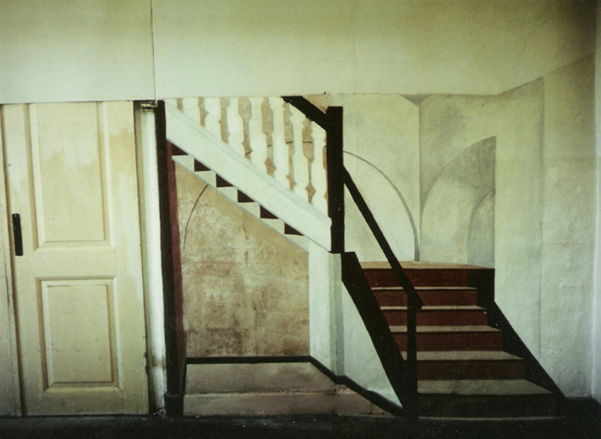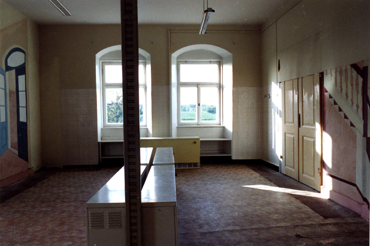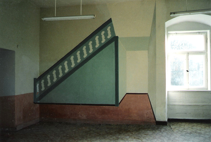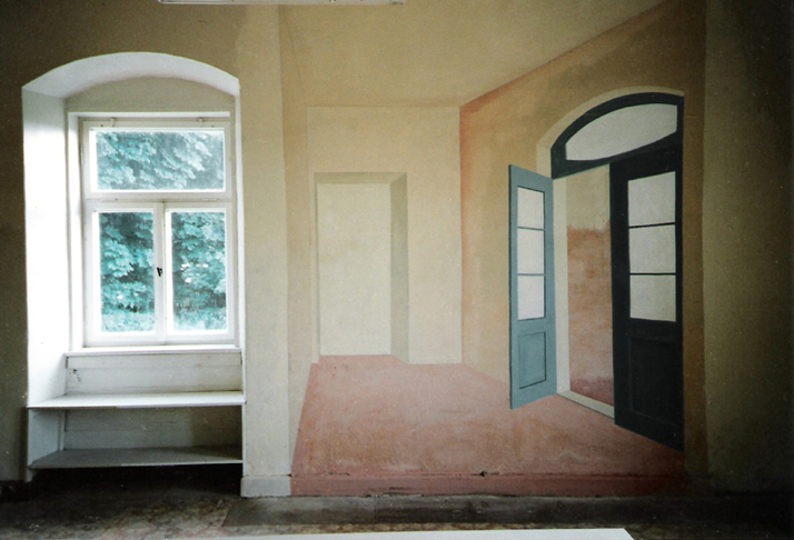 The interior walls of the empty former Konsum shop (floor area ca. 5.6 x 12 m) in an outbuilding of the castle of Plüschow were painted with architectonic motifs. On three of the wall surfaces, scenes from the castle are reproduced.