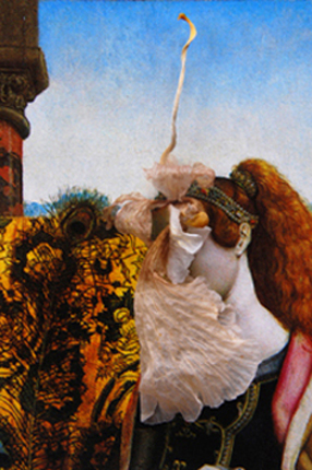 These photographic portraits were created through an intervention in four pictorial motifs taken from museums of European painting. The background is formed by paintings from the Staatliche Kunsthalle Karlsruhe and the Landesmusem Mainz,among them a grisaille by Matthias Grünewald and a tempera by the Master of the St. Bartholomew Altar.