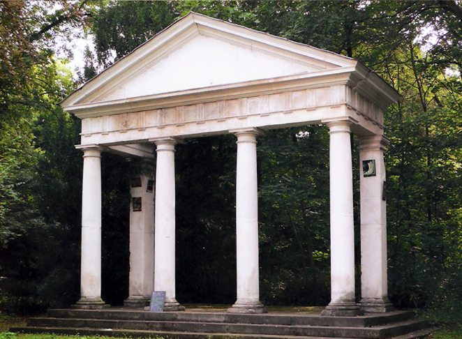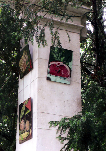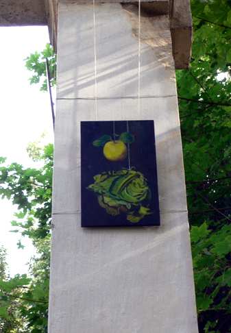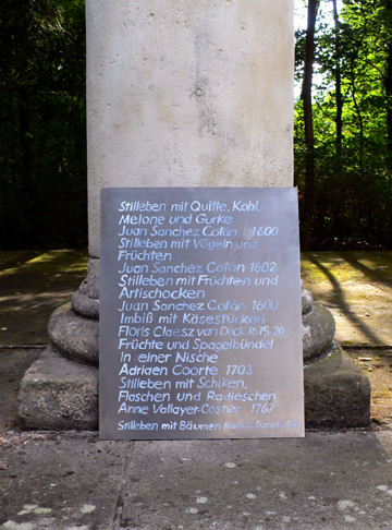 Bombs destroyed the cookhouse at Schloß Georgium in 1945. What remained was the portico, borrowed from ancient temple architecture. Many visitors have assumed it was an artificial ruin. Here Nanaé Suzuki hung seven oil paintings high up on the two rear pillars, with a dense grove of trees as a backdrop. She selected details from kitchen still lifes by 16th and 17th century Dutch, French and Spanish painters and copied them with her characteristic highly painterly workmanship. On a platform raised by a few steps was a metal plaque – like a store sign – with handwritten descriptions, names and dates of the copied pictures; the last line read: »Nanaé Suzuki Still Life with Trees / 2006«.