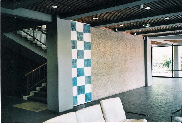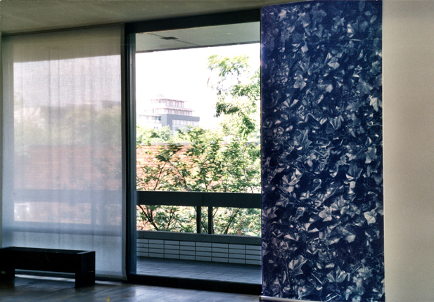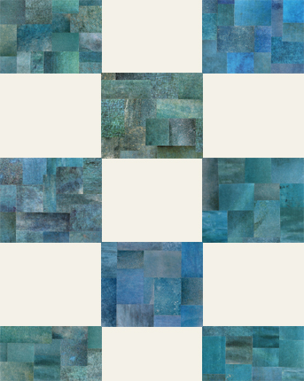 Inspired by the interior of Shokintei, the famous teahouse in the imperial Villa Katsura in Kyoto, I designed a wall piece in a chessboard pattern. The blue fields consist of 205 painted skies that I have taken from reproductions of paintings by European old masters.