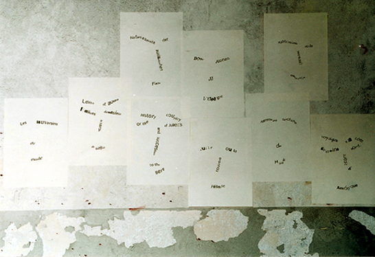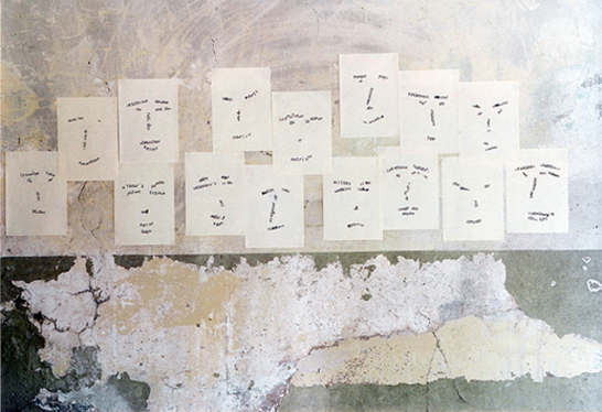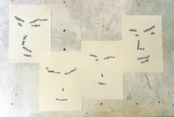 For this portrait series, I chose about 100 titles from the index of the still extant library of von Massow. Each book took shape as a face with a different expression, as each was printed in the most disparate fonts. The group portraits on the wall resemble the souls of books that materialize before us out of the past.