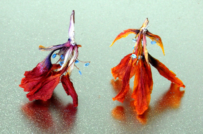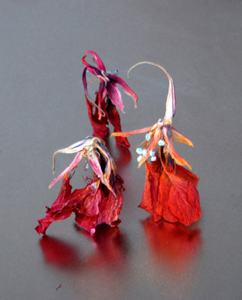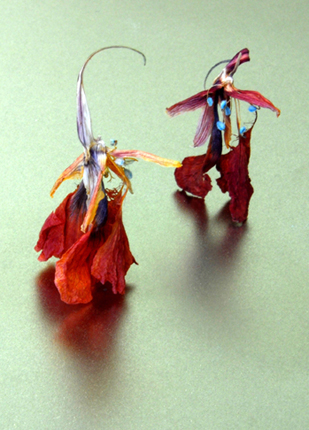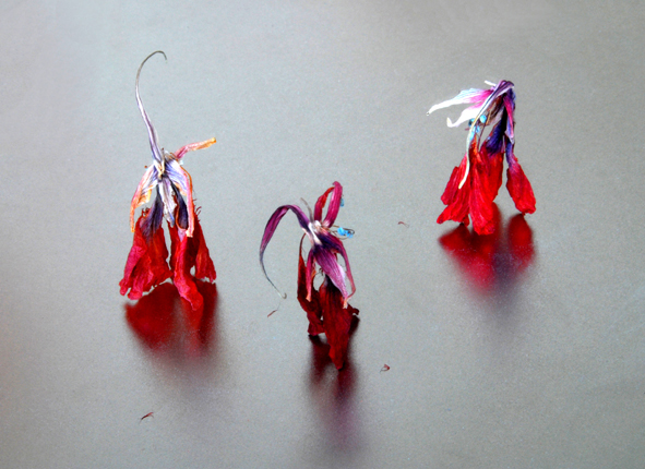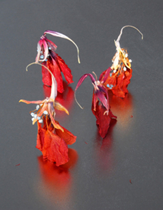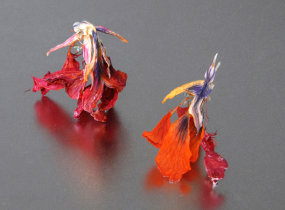 Dimensions variable The rendering of altered perception through a change of perspective is a central element of Nanaé Suzuki's work. In this process, her gaze orients itself both on spaces and on existing images, all of which, like vision itself, are constructed. For her photographic work “In Szene” she arranges withered nasturtium blossoms. Without any manipulation of the medium they appear like dancing beings. Instead of focusing on time and its usual association with death and transience, she orients the gaze on the staging of other possibilities for observation and meaning. (Frank Wagner, from the catalogue of the exhibition “gehen blühen fließen”)